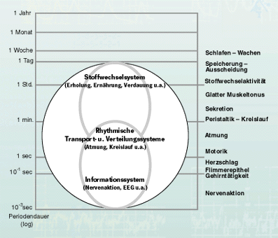 Die langsamen Rhythmen des autonomen Bereichs dienen dagegen vornehmlich dem Stoffwechsel und seinen Funktionsbereichen, sie ordnen Stoffaufnahme und -ausscheidung, Verdauung, Sekretion und Energiespeicherung. Während die Informationsrhythmen streng an höchst differenzierte räumliche Strukturen des Nervensystems gebunden sind, betreffen die Stoffwechselrhythmen mehr oder weniger alle Gewebe, sind räumlich viel weniger spezifiziert. Den Übergang zwischen diesen beiden so gegensätzlichen Funktionsbereichen bildet das System der rhythmischen Transport- und Verteilungsfunktionen, insbesondere mit den Rhythmen von Kreislauf und Atmung.
