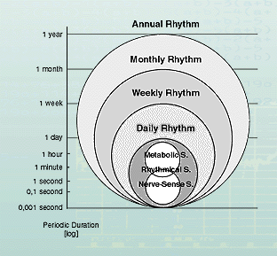 In its center, however, the functional behavior of breathing and heart rhythm produces a balance, thereby forming an organic foundation for rhythmic-musical sensations and actions. And, at the same time, we must not forget that this three link structure of human time organism is linked and infiltrated as a whole by the cosmic proportions and harmonies of environmental rhythms (cf. illustration 21).